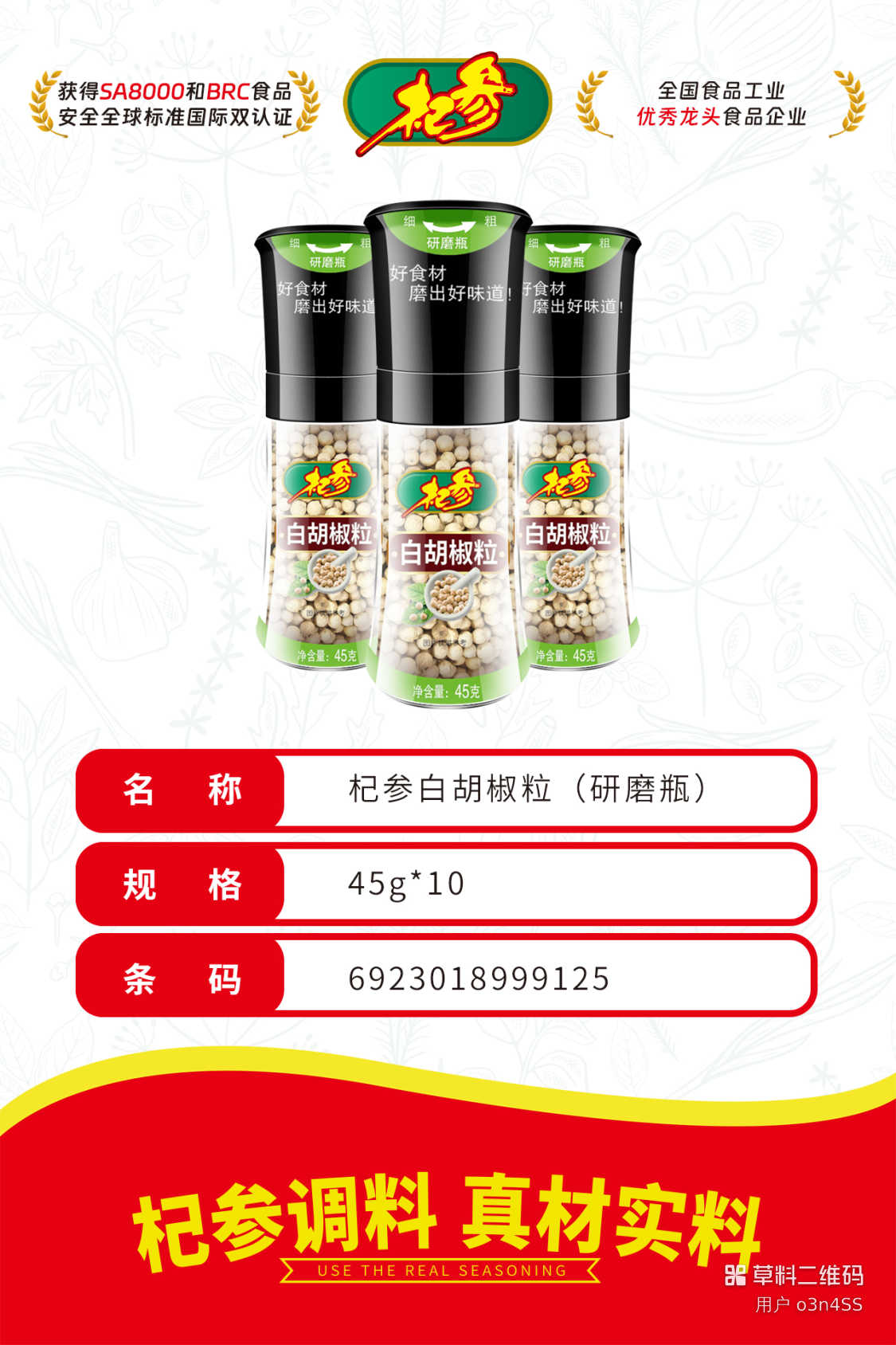 杞参白胡椒粒(研磨瓶)45g